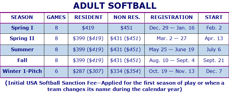 Divisions offered are Recreational (0 homeruns allowed per game), Novice (1 homeruns allowed per game) Intermediate (2 homeruns allowed per game), and Advanced (3 homeruns allowed per game)across Men’s and Co-Ed divisions. Games are offered Mondays—Fridays. League champions receive a plaque and champion t-shirts each season.