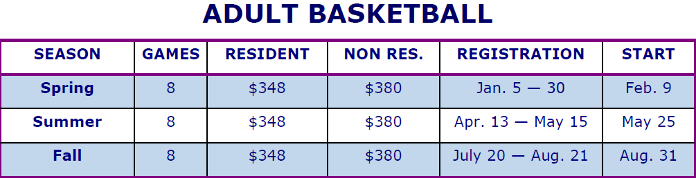 Adult Basketball is scheduled at various Recreation Centers across the Austin city limits. Divisions offered are High, Medium, and Low across Men's and Co-Ed divisions. Games are offered Mondays—Thursdays. All teams from each division advance into a single elimination playoff bracket. The winning teams receive a trophy and champion jerseys each season.